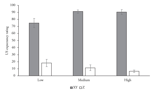 Last acquisition trial differences due to state anxiety. Visual analog scale scores during the last trial of the acquisition phase for reinforced (X and Y) and a non-reinforced (Z) stimuli in a differential conditioning procedure. Scores are presented for subjects with low, medium, or high levels of state anxiety. Error bars represent standard error of the mean.