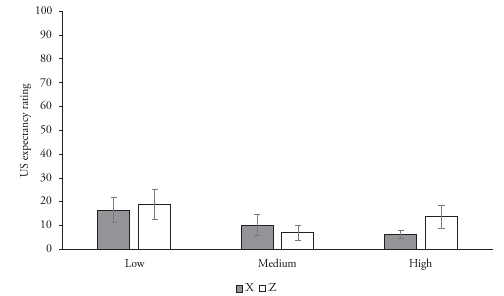 The vas scores for us expectancy in presence of the excit- atory cues X and Y were not different during acquisition (. > .05), so their data was pooled as one. Mixed anova for all groups on the four acquisition trials and cue (X-Y and Z) showed a main effect of trial, . (1, 83) = 8.31, mse = 3,394.60, . = .00, η²p = .048, and a significant Trial × Cue interaction, . (3, 83) = 96.40, mse = 39,398.70, . = .00, η²p = .37, but no interaction with group of state anxiety (.> .05), showing no effect of state anxiety across acquisition trials. vas scores for X-Y during the last acquisition trial were compared to responses to the non-reinforced stimulus Z to assess differences at the end of acquisition. These scores are presented in Figure 2. The anova showed a main effect of stimulus, . (1, 83) = 275.86, mse = 221,605.60, p = .00, η²p = .78, 95% cis [80.37, 90.10]-[7.84, 16.39], with a higher average score for the excitatory stimuli (. = 85.25, SD = 23.96) than for the non-reinforced stimulus (. = 12.12, SD = 20.99) during the last trial of acquisi- tion. There was also a significant Stimuli × State Anxiety interaction, . (2, 83) = 3.86, mse = 3,109.60, . = .00, η²p = .09. Post-hoc comparisons showed that participants in the medium and high anxiety groups showed a bigger difference between the excitatory cues and Z– than the participants in the low anxiety group, 95% ci for X-Y-low anxiety: [61.62, 88.05] vs. X-Y-medium anxiety: [86.25,96.04], X-Y-high anxiety: [83.48, 96.04] vs. Z-low anxiety: [7.13, 29.01], Z-medium anxiety: [2.70, 19.85] vs. Z-high anxiety: [2.69, 9.81]. All other comparisons were not significant, all .s > .05.