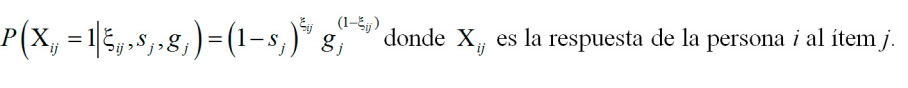 El modelo DINA divide a las personas en dos clases para cada ítem: aquellas que dominan todos los atributos requeridos para tal ítem y aquellas que no los dominan, por lo que modela la probabilidad de acertar un ítem a partir de dos parámetros: 1) la posibilidad de que una persona se equivoque al responder un ítem aun cuando domina todos los atributos requeridos ( denota el parámetro de “equivocaciones”), y 2) la probabilidad de que una persona acierte un ítem a pesar de que no posea todos los atributos que se requieren ( denota el parámetro de “adivinación”). La probabilidad de respuesta a un ítem se escribe así: