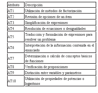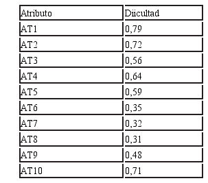 Como se muestra en la tabla 2, el AT1 (utilización de métodos de factorización) fue el más fácil, dado que es dominado por el 79% de las personas examinadas; a dicho atributo le siguen el 2 y el 10, que corresponden a la revisión de opciones de un ítem (72% de dominio) y la utilización de propiedades de potencias o logaritmos (71%). Los dos atributos que se consideran de mayor dificultad son el 8 y el 7 que corresponden a la verificación de proposiciones (dominado por un 31%) y la determinación o el cálculo de conceptos básicos de funciones (32% de dominio).