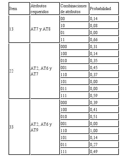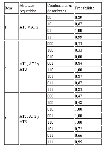 Para los ítems 2 y 3, la situación es diferente a la ya descrita. No dominar ninguno de los atributos requeridos brinda probabilidades de acierto iguales a 0,23 y 0,47, respectiva- mente. En particular, para el ítem 2, las personas que dominan únicamente el AT2 tienen una probabilidad nula de acierto. No obstante, para el ítem 3, basta con que las personas dominen el AT2 o el AT3 (simplificación de expresiones) para garantizar el éxito en este ítem.