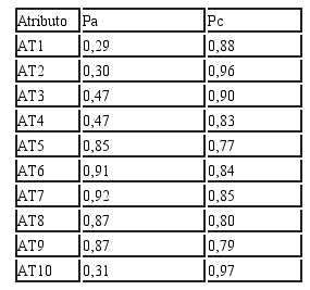 En la tabla 5 se muestran los valores de Pa y Pc para cada uno de los atributos empleados en el estudio que se muestra en este artículo.