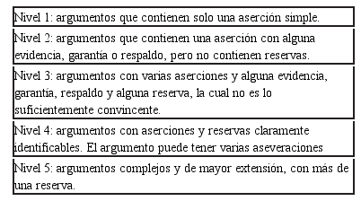 La argumentación es una actividad social, dialógica, intelectual y lingüística mediante la cual se intenta convencer a otros individuos de la factibilidad de un punto de vista específico (Eemeren y Grootendorst, 2003; Eemeren, Houtlosser, y Snoeck, 2007). Argumentar es usar herramientas verbales (orales o escritas), habilidades racionales e indicadores argumentativos para alcanzar dicho objetivo (Eemeren et al., 2007; Kuhn y Udell, 2003). Toulmin (1958) concibe la argumentación como una manera de generar conocimiento y cambios conceptuales a partir de una lectura crítica de la información disponible, considerando los contextos sociales, históricos y culturales que inciden en cómo se utiliza dicho conocimiento. En este contexto, un argumento consta de seis elementos fundamentales: (1) la aserción o tesis que un participante expone, (2) la evidencia o bases que sostienen esa aserción, (3) la garantía que sostiene la relevancia de la evidencia, (4) el respaldo, que agrega validez a las garantías, (5) la reserva, que puede ser una objeción, refutación o excepción a una aserción, y (6) el calificativo moral o nivel de certeza que se tiene frente a esa aserción. Toulmin además afirma que es posible categorizar los argumentos según su nivel de calidad; niveles que estarían dados por la existencia de mayor o menor número de componentes, y en especial la presencia o ausencia de reservas o refutaciones. De este modo, los de menor calidad se caracterizan por estar conformados por una aserción simple, o una aserción y alguna evidencia de menor peso; mientras que un argumento de más alta calidad puede contener varias aserciones con sus respectivas garantías y evidencias, e idealmente varias reservas que refuten las aserciones originales. A partir de esta categorización ha surgido una línea de investigación que ha examinado la calidad de los argumentos construidos por los participantes de distintos contextos de discusión (Suthers, Toth y Wiener, 1997; Pontecorvo y Girardet, 1993; Means y Voss, 1996), de discusiones científicas (Osborne, Erduran y Simon, 2004; Simon, Erduran y Osborne, 2006) y matemáticas (Wood, 1999).