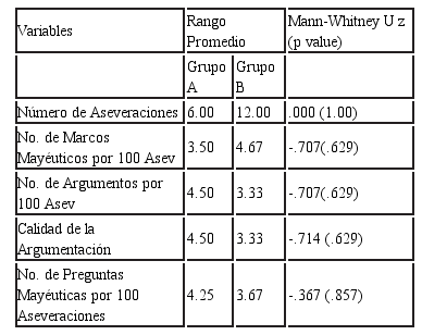 En segundo lugar, y para comprender mejor los resultados de la prueba de Mann Whitney-U, se analizaron las transcripciones por separado. En la tabla 3 se muestran los valores de las variables por seminario, agrupadas por establecimiento. El grupo A incluye las transcripciones de los seminarios 1, 3, 4 y 6, y el grupo 2 los seminarios 2, 5 y 7. Las columnas a la izquierda presentan el promedio y rango para cada variable, así como también el número de aseveraciones por seminario en cada grupo. De estos datos se desprende que los valores promedio de marcos mayéuticos por cada 100 aseveraciones por grupo son 3.63 para el grupo A y 4.14 para el grupo B, y la cantidad de argumentos por cada 100 aseveraciones es de 9.28 para el grupo A y 7.91 para el grupo B, lo que los hace bastante similares. En términos de rangos y promedios para el número de preguntas los valores son también similares entre los grupos: .155 y .113 respectivamente para las medias, y rangos de .01 a .31 para el grupo A y .01 a .32 para el grupo B. En términos de calidad de la argumentación, sin embargo, hay una diferencia importante entre el seminario 5, que alcanza un puntaje de calidad de argumentación de 3.0, lo que es considerablemente inferior al rango que se observa en los restantes seis seminarios, cuyos valores fluctúan entre 4.8 y 5.4. Por lo tanto, el seminario 5 es el único que difiere significativamente de los demás seminarios analizados.