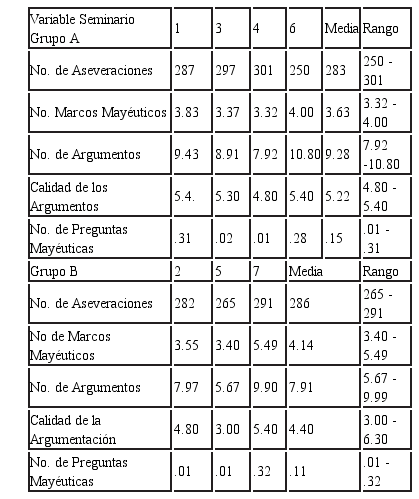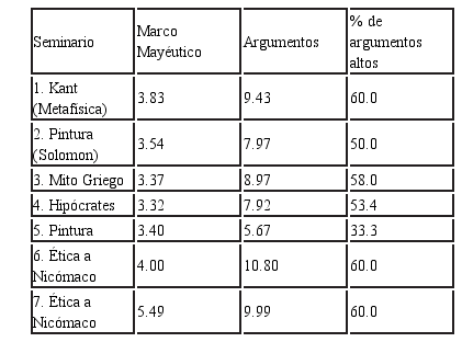 En términos generales, el promedio de marcos mayéuticos por cada 100 aseveraciones, considerando la totalidad de los seminarios analizados, fue de 3.85, con una desviación estándar de .76, en tanto que el promedio de argumentos fue de 9.29, con una desviación estándar de 1.05.
