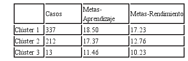 Clúster 1: Metas de Aprendizaje Alta, Metas de rendimiento Alta Clúster 2: Metas de Aprendizaje Altas, Metas de rendimiento Medias. Clúster 3: Metas de Aprendizaje Medias, Metas de rendimiento Medias.
