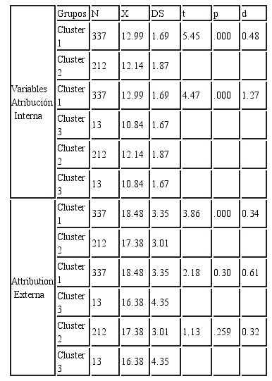 Con respecto a la atribución causal interna los sujetos que integran el clúster 1, presentan diferencias significativas con los integrantes de los clústeres 2 y 3, muestran una mayor atribución causal interna (t=5.45, p=000, d =0.48; t= 4.47, p= 000, d= 1.27). Por otro lado no existen diferencias signiicativas entre los sujetos del grupo 2 y 3.
