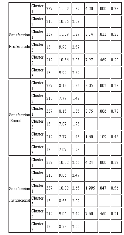 La satisfacción proveniente de las relaciones de los compañeros entre sí y con los profesores se encuentra más elevada en el clúster 1 y esta diferencia es significativa con el grupo 2, (t=3.05, p= 002, d= 0.28) y con los integrantes del grupo 3 (t=2.75, p= .006, d=0.78).