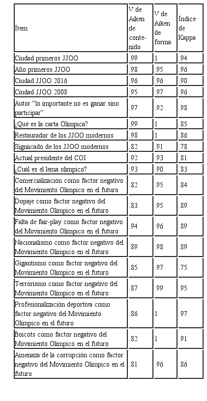 Por último, para el estudio de los valores de fiabilidad (test-retest) del total del cuestionario se aplicó la prueba Coeficiente de Correlación Intraclase, obteniendo un valor de .87, mientras que, para cada uno de los ítems que componen el cuestionario, se calculó el índice de concordancia de Kappa (tabla 1), apreciándose valores muy elevados (Altman, 1991; Atkinson y Nevill, 1998) así como los resultados de la V de Aiken de contenido, que obtuvo unos valores mínimos de .80 y V de Aiken de forma, con valores mínimos de .90, siendo superiores a los mínimos indicados por Penield y Giacobbi (2004).
