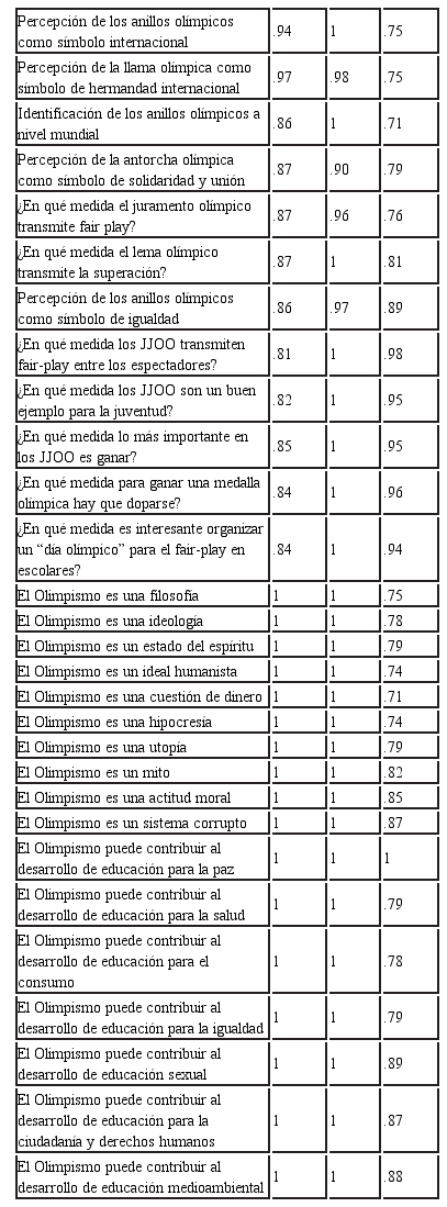 Si atendemos a los resultados que hacen referencia a la consistencia interna del cuestionario, el primer bloque, constituido por la dimensión de conocimiento sobre el Movimiento Olímpico muestra un coeficiente alfa de Cronbach de .73, mientras que el segundo bloque, constituido por el resto de factores muestra un valor superior, esto es, .90, valores considerados como bastante aceptables. Por otro lado, la consistencia interna obtenida para los diferentes factores de este segundo bloque fue la siguiente: opinión sobre los posibles riesgos y/o amenazas a los que se enfrenta el Movimiento Olímpico ( α = .81), símbolos olímpicos ( α= .94), valores que pueden transmitir los JJOO (α = .84), significado del Olimpismo (α = .87) y contenidos educativos del Olimpismo en el curriculum escolar (α = .88).