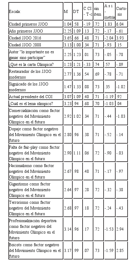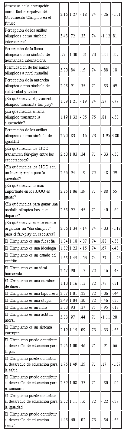Por otro lado, las características de los ítems que forman el cuestionario sobre la visión del Olimpismo y sus repercusiones educativas en estudiantes universitarios fueron analizadas comprobando si el alfa de la escala aumentaba con la eliminación de algún ítem, así como atendiendo a las indicaciones apuntadas por Nunnally y Bernstein (1995) para conservar un ítem dentro de un factor: coeficiente de correlación corregido ítem-total (CCIT-c) ≥ .30 y desviación típica (DT) > 1. Por lo tanto, dos ítems fueron eliminados del cuestionario, debido a los bajos valores presentados. Como se puede comprobar en la tabla 2, y según las recomendaciones de Bollen y Long (1994), los índices de asimetría y curtosis son próximos a 0 y < 2 en la mayoría de los ítems.