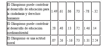- Factor 4. Significado del Olimpismo, que trataba de conocer la opinión sobre los elementos esenciales que caracterizan al Olimpismo moderno.