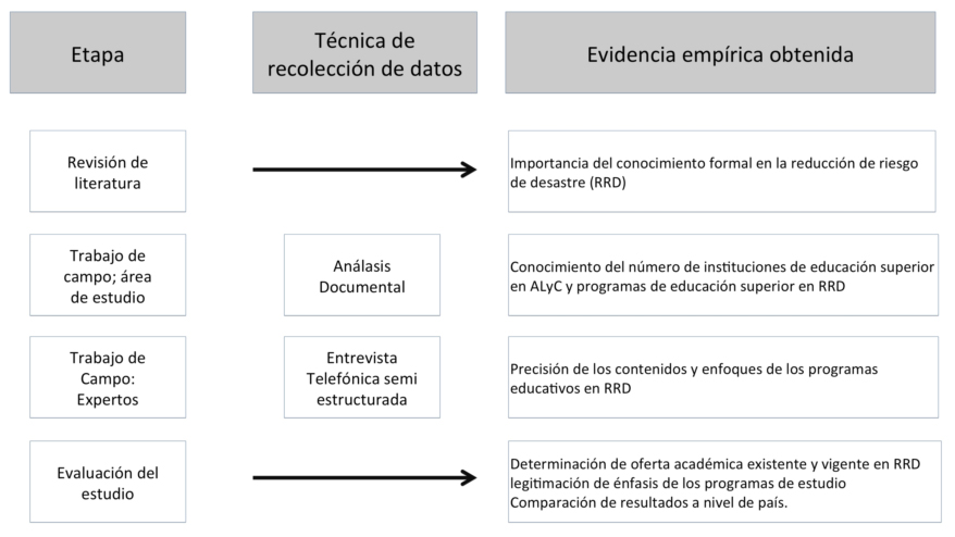 Respecto a las técnicas de recogidas de datos (Del Rincón, Latorre, Arnal y Sans, 1995), se diseñaron, validaron y aplicaron dos instrumentos complementarios: 1) una Ficha de contenidos, cuyo diseño consagró cuatro categorías: a) antecedentes generales, que permitían la identificación de la oferta de estudio; b) descripción del programa de estudio; c) contenido curricular y; d) énfasis en el enfoque del programa (presencia conceptual de los tópicos de gestión integral del riesgo; resiliencia y vulnerabilidad, además del área del conocimiento al cual está dirigido); 2) una entrevista telefónica, semiestructurada, a las diversas partes interesadas, conformadas por las siguientes instituciones: Capítulos nacionales de REDULAC y encargados de programas educativos. La entrevista se aplicó, como técnica complementaria al análisis documental, con el objeto de precisar ciertos aspectos de los programas de estudio y, al igual que la ficha de contenidos, abarcó cuatro categorías: a) antecedentes generales de las ofertas; b) descripción de los programas, c) contenido curricular; y d) énfasis del enfoque del programa de estudio.