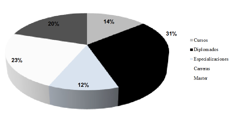 Existe una diversidad de programas de estudios existentes en ALyC, los cuales responden a una realidad diferenciada y un énfasis específico, que cada país otorga a la gestión y reducción del riesgo de desastres, en combinación de su estructura de educación superior. En este sentido, el subconjunto de “especialidades” configurado por cursos, diplomados y especializaciones, son la oferta académica que mayor presencia tiene en ALyC. Por otra parte, se estableció que las carreras de pregrado son la segunda fuerza de programas de estudios en RRD, denotando así el interés, de algunos países, en formar profesionales en este tópico. También los programas de Postgrado aparecen en esta gama de ofertas, donde los Masters lideran, en totalidad, el grupo, ya que no existe programa de Doctorado, en RRD, que se imparta en ALyC (Tabla 4 y Figura 2).