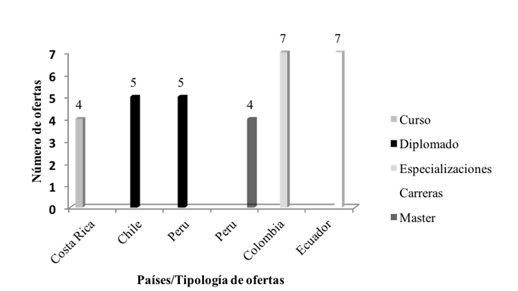 Si comparamos la variación existente de la oferta educativa en gestión del riesgo y reducción de los desastres naturales, entre 2009 al 2014 en AlyC, prácticamente no presenta mayores hallazgos estadísticos globales (Tabla 4). Centrándose en los países que lideran cada tipo de oferta académica vigente, resultó que por cada tipo de programa, diferentes países lideran dichas ofertas. En este contexto destaca Perú, que lidera, tanto los diplomados existentes, como los postgrado en su categoría de maestrías. Además, es el segundo país con mayor número de programas académicos vigentes (Tabla 4 y Figura 3). Éste, sólo es superado por Colombia y deja en tercer lugar a Ecuador. Cabe señalar, que los países mencionados superan la barrera de 10 ofertas programáticas, sin embargo, los tres presentan mermas en sus ofertas programáticas, en relación al año 2009. México y Chile, dada su exposición física, recientes experiencias con efectos devastadores, el número de habitantes del primero y el desarrollo económico del segundo, presentaron una disminuida oferta académica en esta materia para el año 2009, hecho que se ha incrementado al año 2014.