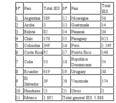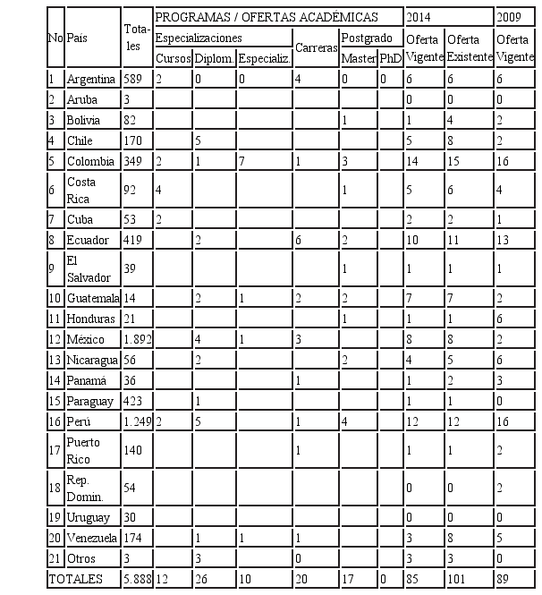 La principal característica metodológica que sustenta esta investigación, es que se utilizó una metodología mixta, que convino enfoques cualitativos y cuantitativos (González, 1997). Respecto al diseño metodológico, esta investigación es documental, combinada con un trabajo de campo, a través de la aplicación de una entrevista telefónica. Con relación al universo muestral, este lo conformaron 5.888 instituciones de educación superior (IES) (concepto que agrupa a universidades, institutos profesionales, centros de formación profesional, centro de formación técnica, fundaciones, institutos superiores pedagógicos, institutos superiores técnicos, escuelas superiores por especialidades y organismos internacionales, habilitados para dictar programas de educación superior) de los 20 países seleccionados, en base a 6 ofertas Académicas (Tabla 1). Además, se incorporó otro campo indicado con el número 21, al que denominamos “otros organismos”. Esta categoría comprendió a fundaciones y organismos internacionales que imparten ofertas académicas para Latinoamérica (Tabla 2).