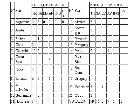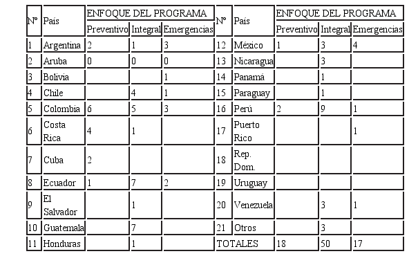 Siguiendo este enfoque, encontramos que el 58,8% de las ofertas académicas vigentes (50 instituciones), abordan la temática del enfoque integrado en sus contenidos, dando énfasis en la determinación de amenazas, conocimiento del riesgo y la vinculación de éste al desarrollo y sus efectos en el medio ambiente. Todo ello, sin descuidar el desarrollo de capacidades que permitan afrontar y gestionar situaciones de emergencias, orientadas a la pronta recuperación de las zonas afectadas por desastres (Tabla 5). Por otra parte, los programas con énfasis en acciones preventivas (gestión del riesgo) o la atención de la emergencia (gestión de desastres) en forma individual, alcanzan el 21,2% y 20% de las ofertas académicas vigentes (18 y 17 ofertas respectivamente); siendo Colombia y México, países donde los números de ofertas, con mayor énfasis en un aspecto del ciclo del riesgo, superan a aquellas que presentan énfasis más general, con miras hacia un enfoque integral.