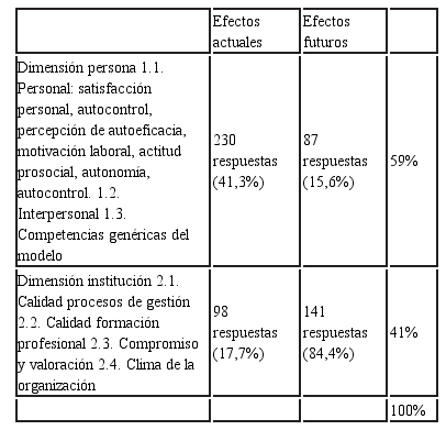A partir de los datos obtenidos y del análisis respectivo se construyó dos grandes categorías de respuestas: percepción de efectos actuales (59% del total de respuestas) y percepción de futuros efectos (41% del total de respuestas). En cada una de las categorías, las respuestas fueron clasificadas en relación al lugar en el cual son percibidos los efectos: Dimensión Persona o Dimensión Institución.
