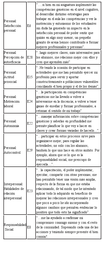 Hay acuerdo en que la formación de competencias genéricas de los estudiantes requiere de la participación activa del cuerpo académico (Mashitoh, 2012). Sin embargo, en relación a aquella, se ha indagado principalmente en la percepción de este grupo sobre la eficacia de la implementación y los efectos en los estudiantes (Corominas et al., 2006; Mashitoh, 2012), sin profundizar en la experiencia personal y en la dimensión afectiva del proceso de desarrollo.
