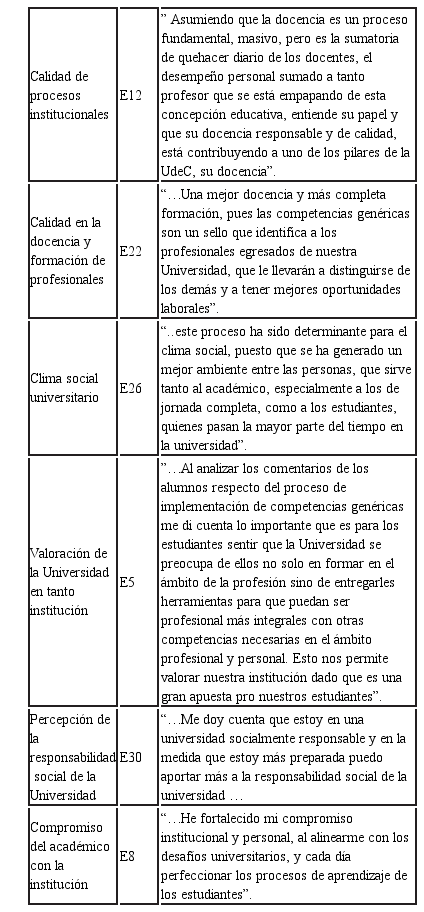 Tema 2: Percepción de efectos institucionales a partir de la participación en el programa de formación en enseñanza y evaluación de competencias genéricas de la Universidad de Concepción de Chile.