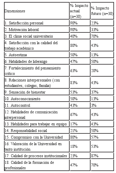 Los datos muestran que al considerar los efectos actuales percibidos por los académicos a partir de su participación en el programa de formación, el 90% de ellos percibe efectos directos en su satisfacción personal y motivación laboral, 83% en las relaciones interpersonales y 80% en la satisfacción con la calidad del trabajo académico y en el compromiso con la universidad. Si bien, sólo un 40% percibe efectos actuales en el clima social universitario, 23% en la calidad de los procesos institucionales y 47% en la calidad de la formación profesional; el 70% percibe que habrá efectos futuros en el clima social, 87% que los habrá en la calidad de los procesos institucionales y 70% en la calidad de la formación profesional. La tabla 5 ilustra esta información e identifica si el efecto en cada dimensión es percibido mayormente de forma actual o en el futuro.