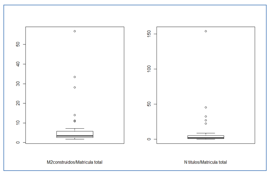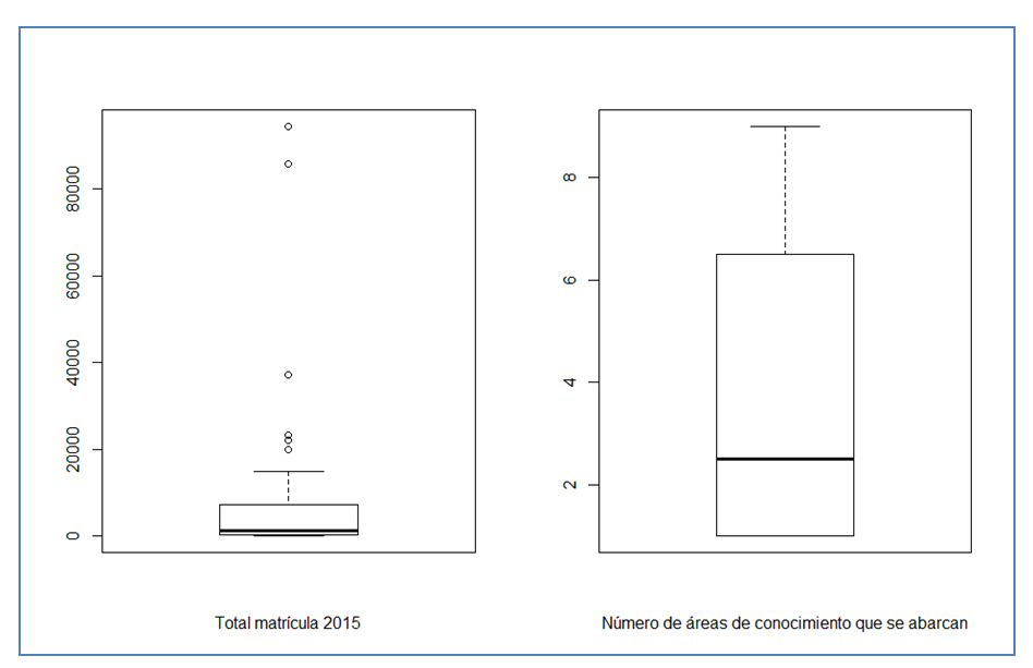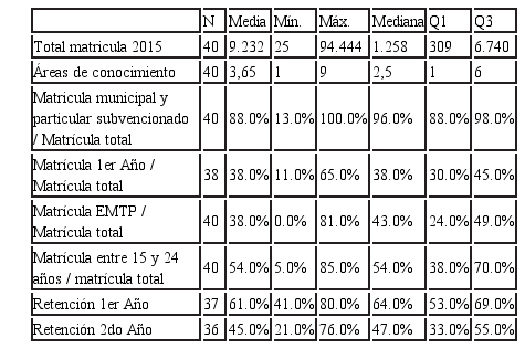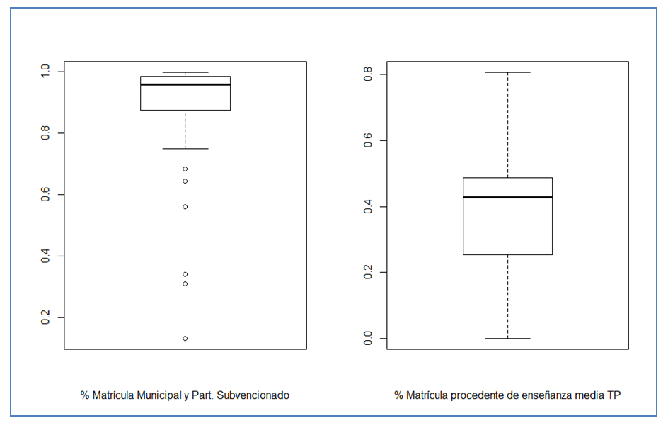Los siguientes dos gráficos de boxplot resumen los resultados obtenidos para cuatro de las variables analizadas: total matrícula 2015, porcentaje de matrícula procedente de establecimientos de dependencia municipal y particular subvencionada, porcentaje de matrícula proveniente de EMTP y número de áreas de conocimiento en que se imparte formación.