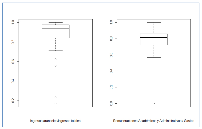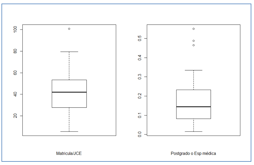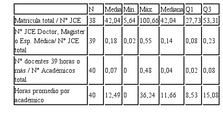 Al desglosar estas cifras en sus rangos de variabilidad, se observa la existencia de algunos IP-s que escapan de los rangos que aglomeran a la mayoría de los casos. Por ejemplo, en un IP la tasa matrícula/JCE supera ampliamente el promedio, llegando a los 100 estudiantes/JCE y en tres IP-s cerca del 50% de la planta académica cuenta con postgrado o especialidad médica.