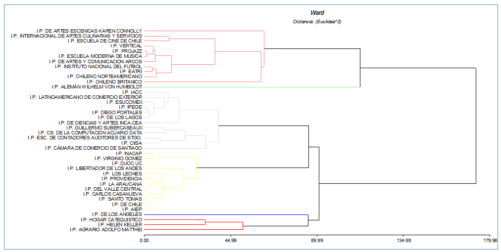 Se observan cuatro conglomerados y dos casos atípicos (los grupos se distinguen por colores en el gráfico). De acuerdo con estos resultados, los dos casos más parecidos en el espacio vectorial generado por las variables de clasificación son AIEP e IP Chile (dentro del cluster amarillo), seguidos de Projazz/Escuela moderna de música (cluster rojo, arriba) y luego IPG/ Diego Portales (cluster gris). Se trata de institutos con características muy similares, los que se aglomeran tempranamente en este procedimiento. En cambio, el que presenta la mayor dificultad de aglomeración es el IP Alemán W. V. Humboldt (verde), seguido del IP de Los Ángeles (azul).