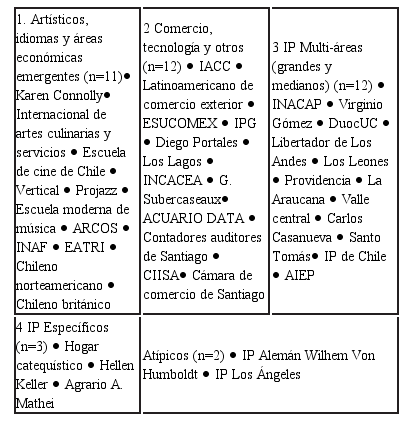 El primer conglomerado se presenta en la parte superior del dendograma y se compone de IP-s dedicados a la formación artística, idiomas o en ámbitos económicamente emergentes. Contiguo a este grupo figura el IP Alemán W.V.Humboldt, el que tiende a compartir con los anteriores -en especial con los de orientación artística- una mayor presencia de estudiantes provenientes de colegios particular pagados. Un segundo conglomerado corresponde al de institutos orientados preferentemente a la formación en el ámbito comercial -contándose entre éstos el Instituto G. Subercaseaux y la Escuela de contadores auditores de Santiago- y en el de la tecnología. A ellos se agregan otros institutos que imparten formación en un mayor número de áreas de conocimiento, como IACC y Diego Portales, ello en función de una mayor similitud en el resto de las variables de clasificación. El tercer grupo corresponde a IP-s que abarcan un mayor número de áreas de conocimiento, entre los que figuran los más grandes: AIEP, DuocUC e INACAP, junto con los de un tamaño de matrícula intermedio. En el último segmento del dendograma se agrupan tres IP-s que imparten formación en áreas específicas, al igual que en el grupo 1, económicamente no tradicionales: IP Hogar catequístico, IP Hellen Keller e IP Agrario Adolfo Mathei. Junto a la especificidad de la formación que imparten, estos tres IP-s se distinguen por contar con una holgada infraestructura y recursos bibliográficos, en relación con la reducida matrícula que congregan.