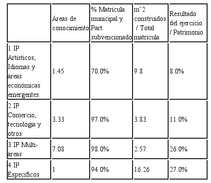 Las variables de mayor importancia para la clasificación son el número de áreas de conocimiento en que se imparte docencia, la procedencia de la matrícula desde la enseñanza media, metros cuadrados construidos y la relación resultado del ejercicio / patrimonio. La tabla 7 resume esta información para los 4 grupos.