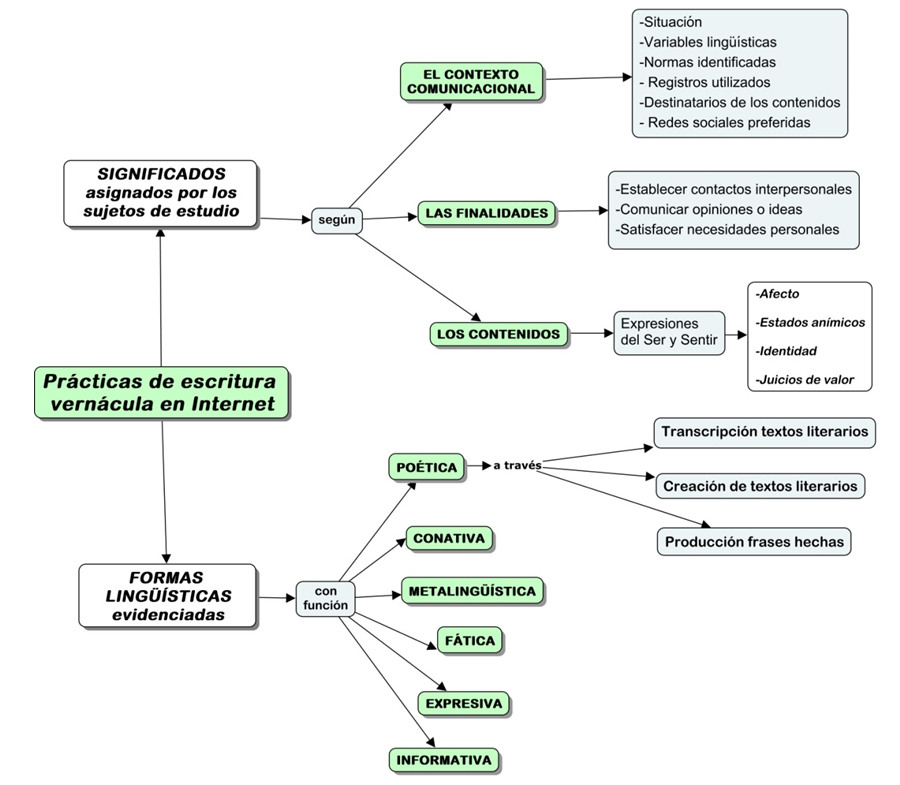 Se identificaron dos grandes divisiones: la primera la de los significados asignados por los sujetos a sus prácticas de escritura vernácula en Internet. La cual corresponde al contenido mental, sentido o concepto que representan los escritos, y que surge bajo la identificación de los condicionantes de los contextos comunicativos, íntimamente concatenados con los contenidos y las finalidades de quien escribe y que motivan sus actos comunicativos. La segunda corresponde las formas lingüísticas evidenciadas en estas prácticas, es decir, un conjunto de formas que adquieren los mensajes y que, para efectos de esta clasificación, confluyen con las funciones del lenguaje. La función que desempeña un mensaje viene determinada por el predominio de alguno de los elementos del proceso comunicativo o porque el mensaje incide de manera directa sobre dicho elemento. En este contexto, se evidenciaron cinco de las funciones del lenguaje, a partir de las cuales se clasificaron las prácticas de escritura verácula de producción: poética, conativa, metalingüística, fática y expresiva. No obstante, esta distinción no es una separación estricta, pues las formas lingüísticas no son solamente envolturas de los significados y mensajes, sino que contribuyen directamente al significado expresado. Es decir, las formas portan elementos de significado y se encuentran completamente interrelacionadas.