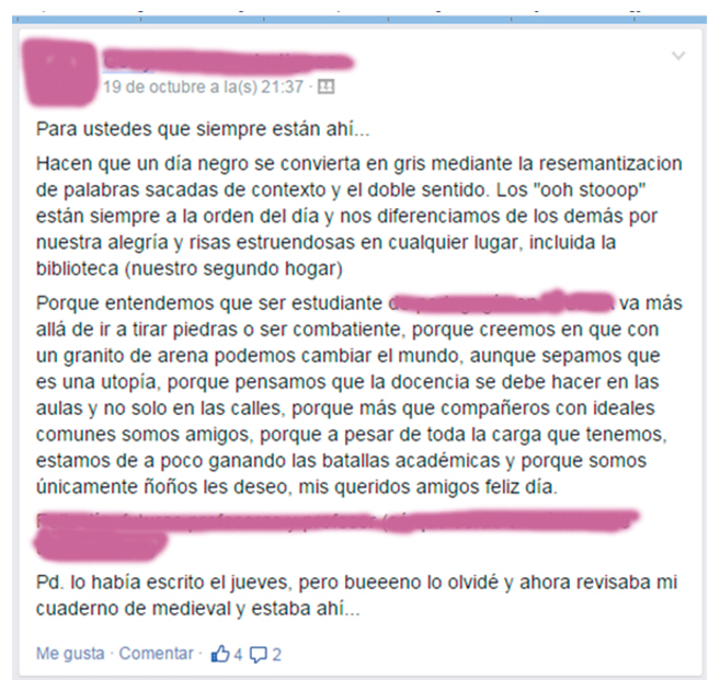 Los resultados del estudio revelan que los sujetos tienen consciencia de sus comunicaciones y a quienes dirigen sus escritos, diferenciando las comunicaciones del ámbito privado (sentimiento y emociones), dirigidas al círculo de amistades y conocidos, de aquellas comunicaciones de carácter más público donde expresan ideas y contenidos sociales; así como las características de los diversos canales de comunicación (Chat, Facebook, etc.).
