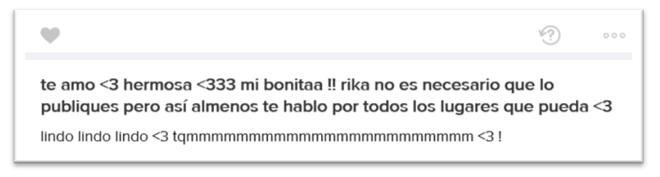 7. Contiene variados mensajes propios con claros fines poéticos, pero también la transcripción de textos de origen literario, que les identifica en sus sentimientos y emociones; los cuales reciclan y comparten profusamente.
