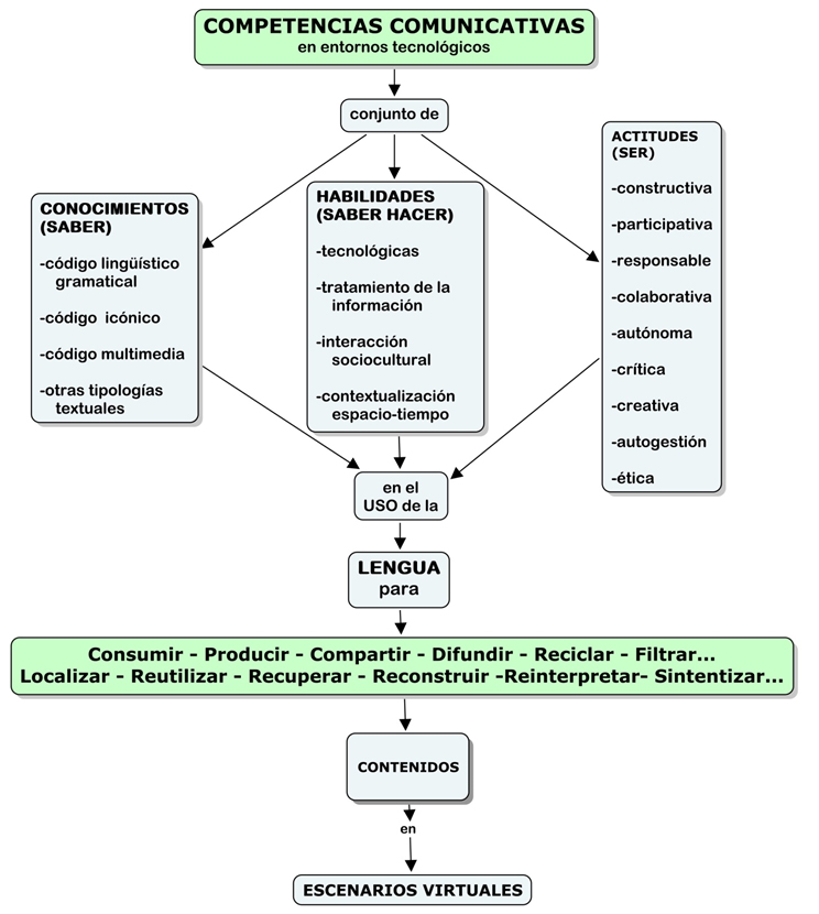 La adquisición de Habilidades mínimas, a saber: La habilidad tecnológica (llamada también competencia tecnológica), que le permita interactuar, a lo menos a nivel de usuario, eficazmente con los diversos dispositivos computacionales y canales informáticos. Habilidades informacionales, que abarcan tanto destrezas lectoras y de comprensión de la información —que le permitan manejarse en los formatos hipertextuales y multimodales propios de las prácticas letradas en pantalla—; así como habilidades para manejar la información, es decir, para la búsqueda, selección, organización y el tratamiento de la información. Lo cual es un aspecto de especial relevancia, dado que una de las características de estos dispositivos letrados, es la gran cantidad de información —mucha de ella, sin aporte alguno— que los jóvenes deben saber manejar (competencia informacional). Habilidades de interacción social, que exige la capacidad de identificar situaciones, registros y formas de acuerdo a los diversos contextos situacionales, sociales e históricos. El mejor hablante es quien en el momento preciso, reconociendo al interlocutor y utilizando las palabras adecuadas, manifiesta sin ambigüedad exactamente lo que desea expresar. Esa premisa es válida para cualquier situación comunicativa, incluyendo aquellas en las que participamos a través de Internet. Lo anterior es consecuente con los componentes pragmático y sociolingüístico de las competencias comunicativas.
