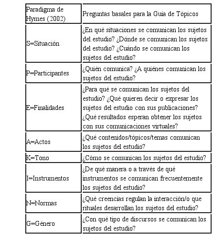 Dado los objetivos formulados en esta investigación, la guía de tópicos para la entrevista fue preparada considerando la naturaleza de lo que se deseaba indagar, es decir, un acto comunicativo (escritos en redes sociales) entre dos o más personas, donde en cualquier situación, el intercambio está regido por reglas de interacción social, que requiere de ciertas competencias comunicativas para llevarlas a cabo. En este escenario se adaptó el modelo de Hymes (2002), que posibilitó un análisis concreto del material contextual (Ver Tabla 1).