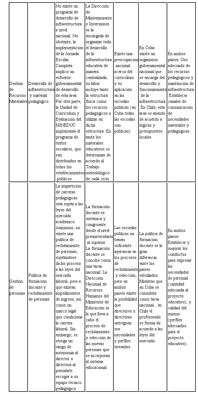 La gestión de materiales pedagógicos y de infraestructura en ambos países se ve como un factor condicionado a la realidad de la gestión financiera. A pesar de ello, parece existir una mayor autonomía en el ámbito del uso de recursos materiales-pedagógicos, más que en el tema de infraestructura. En ambos países estos recursos son utilizados en el marco de un proyecto pedagógico en particular. Mientras que la gestión de personas es un ámbito de coincidencia superficial, en la medida que en ambos países los directores y directoras de escuelas poseen poca injerencia en los procesos de reclutamiento de nuevo personal, excepto el poder determinar perfiles de cargo y expresar sus necesidades a las autoridades competentes. Salvada esta coincidencia, los procesos de reclutamiento de personal son distintos en Cuba y en Chile, ya que en un país se desarrolla como proceso centralizado en función de los objetivos del sistema educacional, mientras que en el otro país se desarrolla en función del mercado laboral, respectivamente. En Chile la formación docente se entrega a las leyes del mercado académico, mientras que en Cuba, la formación docente es una tarea garantizada y organizada por el Estado.
