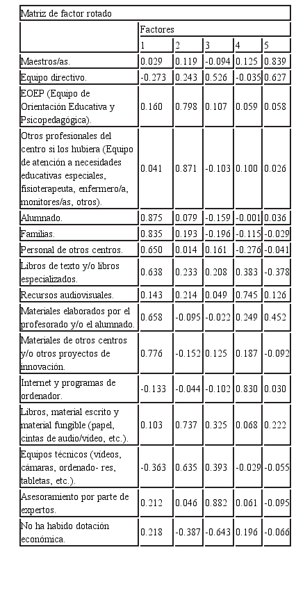 De la matriz de estructura factorial (tabla 7), obtenida con el método de extracción de análisis de componentes principales, se deduce la correspondencia entre cada variable y cada uno de los factores extraídos. Así, el factor 1 podría denominarse Recursos personales y material del profesor, el factor 2, denominado Otros profesionales y material del alumnado, el factor 3, denominado Expertos y sin dotación, el factor 4, Audiovisuales y ordenador y el 5º factor denominado Maestros y Equipo Directivo.
