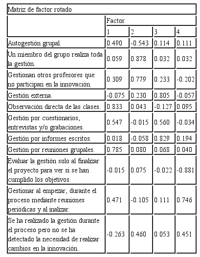 Utilizando el método de extracción de análisis de componentes principales se obtiene la matriz de estructura factorial (tabla 8) a partir de la cual se puede inferir la correspondencia entre cada variable y cada uno de los factores extraídos. Así, el factor 1 podría denominarse Tipo de gestión, el factor 2, gestores, el factor 3, gestores externos y, finalmente el factor 4, Momentos de la gestión.