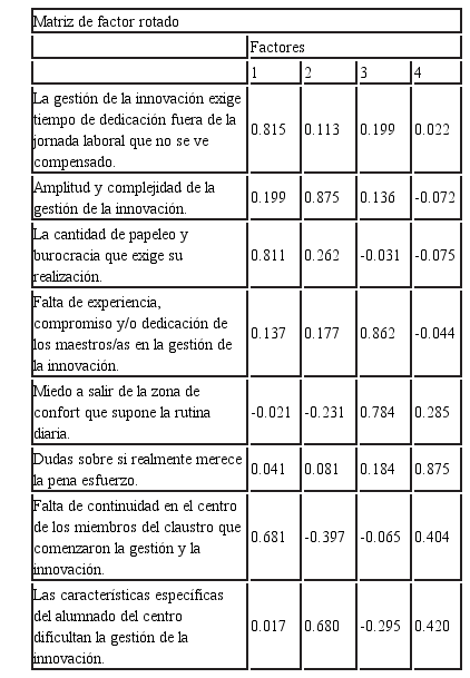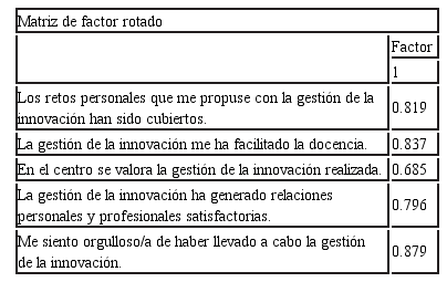 Analizando los valores de las comunalidades asignadas inicialmente a las variables y a las reproducidas por la solución factorial según el método de extracción de análisis de los factores principales se observa que la variable con una menor comunalidad de extracción es En el centro se valora la innovación realizada que solo reproduce un 46.9% de su variabilidad original. De las variables asociadas con esta dimensión se obtiene una matriz definida únicamente por un factor, que explica el 65% de la varianza (índice de KMO=0.811, prueba de esferidad de Bartlett P<0.001). Examinando el gráfico de sedimentación se confirma que sólo deben extraerse un factor. De esta manera, no tiene sentido realizar la rotación ortogonal Varimax por lo que en la tabla 10 se presentan la matriz de factores no rotados.