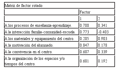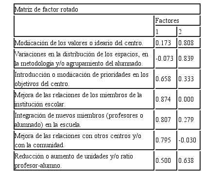 Los valores de las comunalidades asignadas inicialmente a las variables incluidas dentro de esta dimensión y las reproducidas por la solución factorial utilizando el método de extracción de análisis de los factores principales demostraron que la variable Introducción o modificación de prioridades en los objetivos del centro solo reproduce un 54.4% de la variabilidad original, en cambio la variable Mejora de las relaciones de los miembros de la institución escolar reproduce un 76.3% de la variabilidad original.