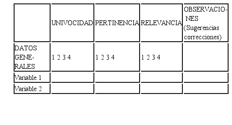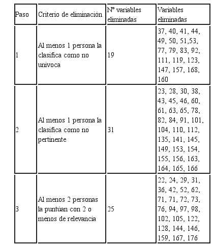 Una vez analizadas las respuestas obtenidas por los expertos, se establecieron los siguientes criterios de validez para determinar si cada una de las variables debía de ser mantenida, mejorada o eliminada (Ver tabla 2).