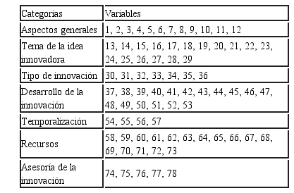 Una vez calculados los valores de las comunalidades asignadas inicialmente a las variables y las reproducidas por la solución factorial según el método de extracción de análisis de los factores principales, se observa que la mayor parte presentan una comunalidad de extracción elevada. De las variables asociadas con la dimensión “Desarrollo de la innovación”, se obtiene una matriz definida por 6 factores que explican el 72% de la varianza (índice de KMO=0.589, prueba de esferidad de Bartlett P<0.001). Resultados corroborados a partir del gráfico de sedimentación.