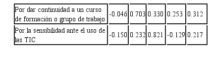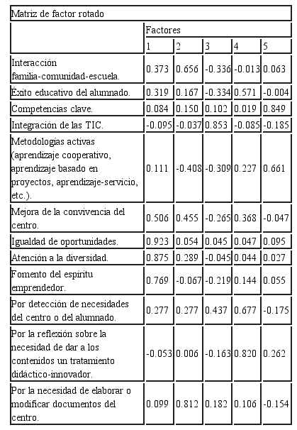 En el análisis inicial, la variable Por iniciativa del Equipo Directivo obtuvo una comunalidad de extracción muy baja, con valor de 0.492, por lo que se decidió eliminar del análisis. De las variables asociadas con esta dimensión, se obtiene una matriz definida por 5 factores que explican el 75.3% de la varianza (índice de KMO=0.560, prueba de esferidad de Bartlett P<0.001). Examinando el gráfico de sedimentación, el punto de inflexión en el que la pendiente deja de disminuir se sitúa a partir del sexto autovalor, por lo que se confirma que sólo deben extraerse los cinco primeros factores. De la matriz de estructura factorial (tabla 4), obtenida con el método de extracción de análisis de componentes principales, se infiere la correspondencia entre cada variable y cada uno de los factores extraídos. Así, el factor 1 podría denominarse Cohesión social, incluyendo las variables Mejora de la convivencia del centro, Igualdad de oportunidades, Atención a la diversidad y Fomento del espíritu emprendedor. El factor 2, denominado Interacción con la comunidad que incluyen las variables Interacción familia-comunidad-escuela, por la necesidad de elaborar o modificar documentos del centro y Por dar continuidad a un curso de formación o grupo de trabajo. El factor 3, incluiría las variables integración de las TIC y por la sensibilidad al uso didáctico de las TIC, y por tanto, lo denominaremos Tecnologías de la Información y la Comunicación. El factor 4 que incluye las variables Éxito educativo del alumnado y Por detección de necesidades del centro o del alumnado, se denominaría Éxito del centro y del alumnado. Finalmente, el factor 5, que incluye las variables Competencias clave y Metodologías activas pasarías a denominarse Nuevas metodologías.