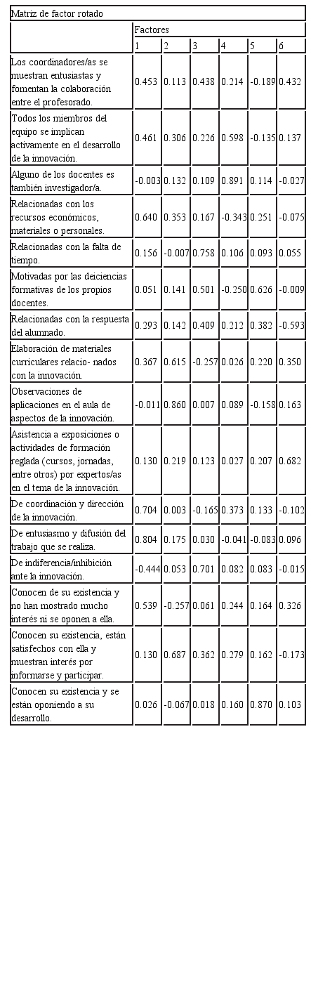 La correspondencia entre cada variable y cada uno de los factores extraídos, es decir, la matriz de estructura factorial, obtenida con el método de extracción de análisis de componentes principales, se muestra en la tabla 6. Así, el factor 1 podría denominarse Recursos y Equipo Directivo, el factor 2, denominado Materiales y participación de las familias, el factor 3 se denominaría Falta de tiempo e indiferencia del Equipo Directivo, el factor 4 se llamaría Implicación e investigación, el factor 5 denominado Deficiencias formativas y finalmente el factor 6, denominado Formación y preocupación por el alumnado.