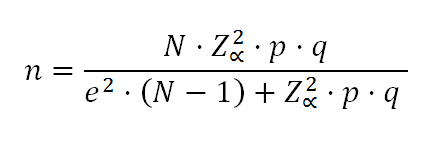 Ecuación 1. Determinación del tamaño de la muestra para poblaciones finitas menores de 100 000 individuos. Donde n es el tamaño de la muestra, N es el tamaño de la población; α es el nivel de significación; p es el % estimado; q es 100-p y e es el error estimado permitido.