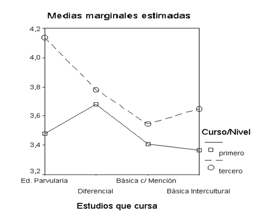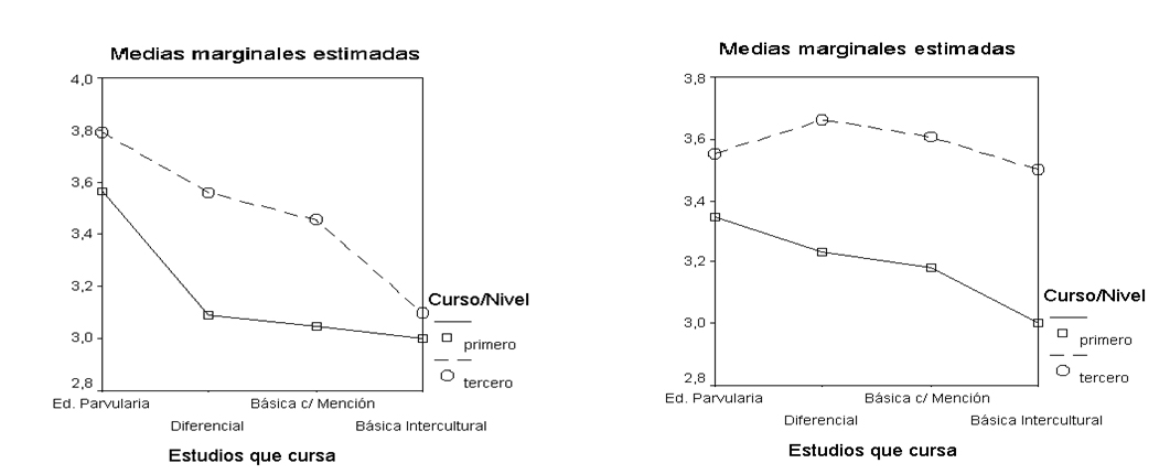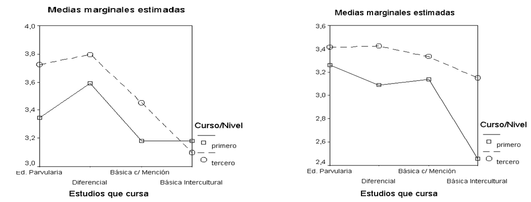 Las diferencias al interior de cada carrera entre ambos colectivos (primero y tercero) no pareciera mantener un comportamiento regular, por el contrario para distintos indicadores cada carrera acorta o aumenta las diferencias de sus medias, llegando incluso como se observa en el gráfico 1 primer año a superar la media de tercero en básica intercultural.