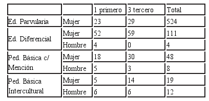Participaron 254 estudiantes de primer y tercer año de las Carreras de Educación Diferencial (45,3 % del total), Educación General Básica con Especialidad (22% del total), Pedagogía de Educación General Básica Intercultural (12,2 % del total) y Educación Parvularia (20,5% del total) de la Facultad de Educación. Cabe señalar que estos porcentajes son proporcionales al número de estudiantes que cada una de estas carreras posee.