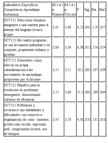 Si bien las diferencias a favor de los estudiantes de tercer año pueden atribuirse al desarrollo de los estudios universitarios en un Modelo de Formación por Competencias como el que propone la Universidad Católica de Temuco, también puede vincularse a otro tipo de factores (como el propio desarrollo evolutivo en sus aspectos afectivos, cognitivos y sociales). No obstante, parece razonable pensar que el proceso de formación juega un papel importante en el desarrollo de esta competencia dado que se vincula específicamente al aprendizaje, como por la política institucional de la universidad que ha priorizado entre las competencias genéricas la de Aprendizaje Autónomo.
