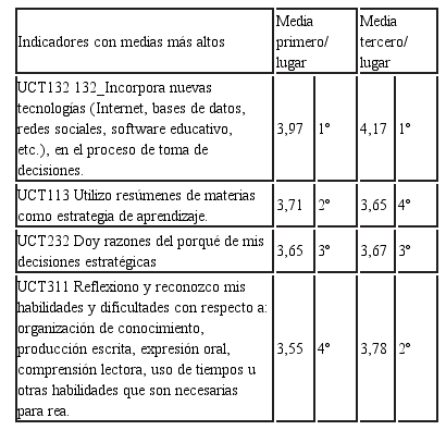 En tanto al analizar los indicadores con las medias más altas (tabla 4) y más bajas (tabla 5) entre estudiantes de primer y tercer año, estos coinciden, con mínimas diferencias en el orden de estas puntuaciones, el puntaje más alto en ambos casos es el referido a la “utilización de nuevas tecnologías en el proceso de toma de decisiones” (UCT132), mientras en primer año le sigue, “la utilización de resúmenes de materias como estrategia de aprendizajes” (UCT113) “el dar razones del porqué de sus decisiones estratégicas” (UCT232) y “reflexionar y reconocer habilidades y dificultades con respecto a la organización del conocimiento, producción, comprensión…” (UCT 311). En tanto que en tercer año a la “utilización de nuevas tecnologías” le sigue el UCT311, luego el UCT232 y el UCT 113. Cabe señalar que el mayor puntaje en tres de los cuatro indicadores lo obtienen los estudiantes de tercer año.