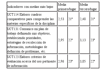 Mientras como se observa en la tabla 5, los indicadores con menor puntaje para ambos colectivos, son los referidos a la estrategia de “elaborar cuadros resúmenes comparativos para comprender las disciplinas específicas” (UCT114), el “comunicar su plan de trabajo definiendo objetivos, estableciendo prioridades, estrategias” (UCT131) y el de “elaborar criterios de evaluación acerca del uso pertinente de la información” (UCT123). Estos tres indicadores de la dimensión de Estrategias de aprendizajes con un indicador de cada uno de los tres niveles establecidos.